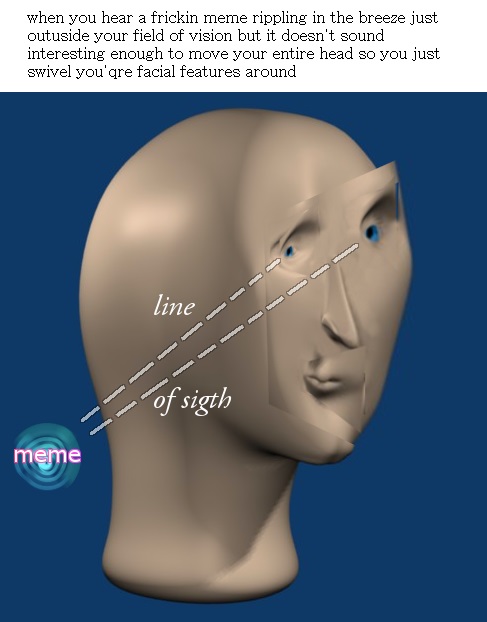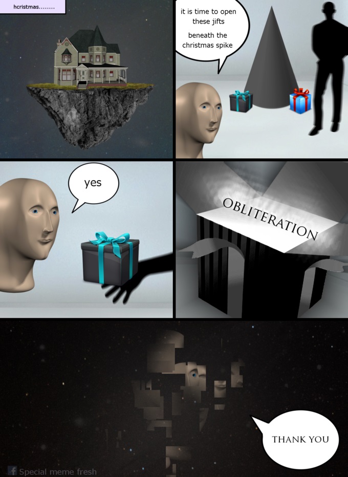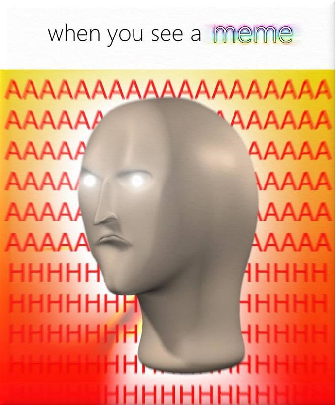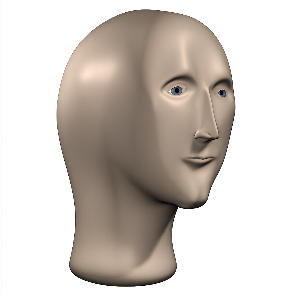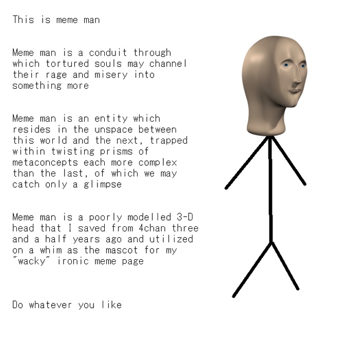 Meme Man refers to a grey 3D rendering of a human head which functions as the mascot for the Facebook page "Special meme fresh." The head is frequently used in absurd edits, surreal memes and shitposting.